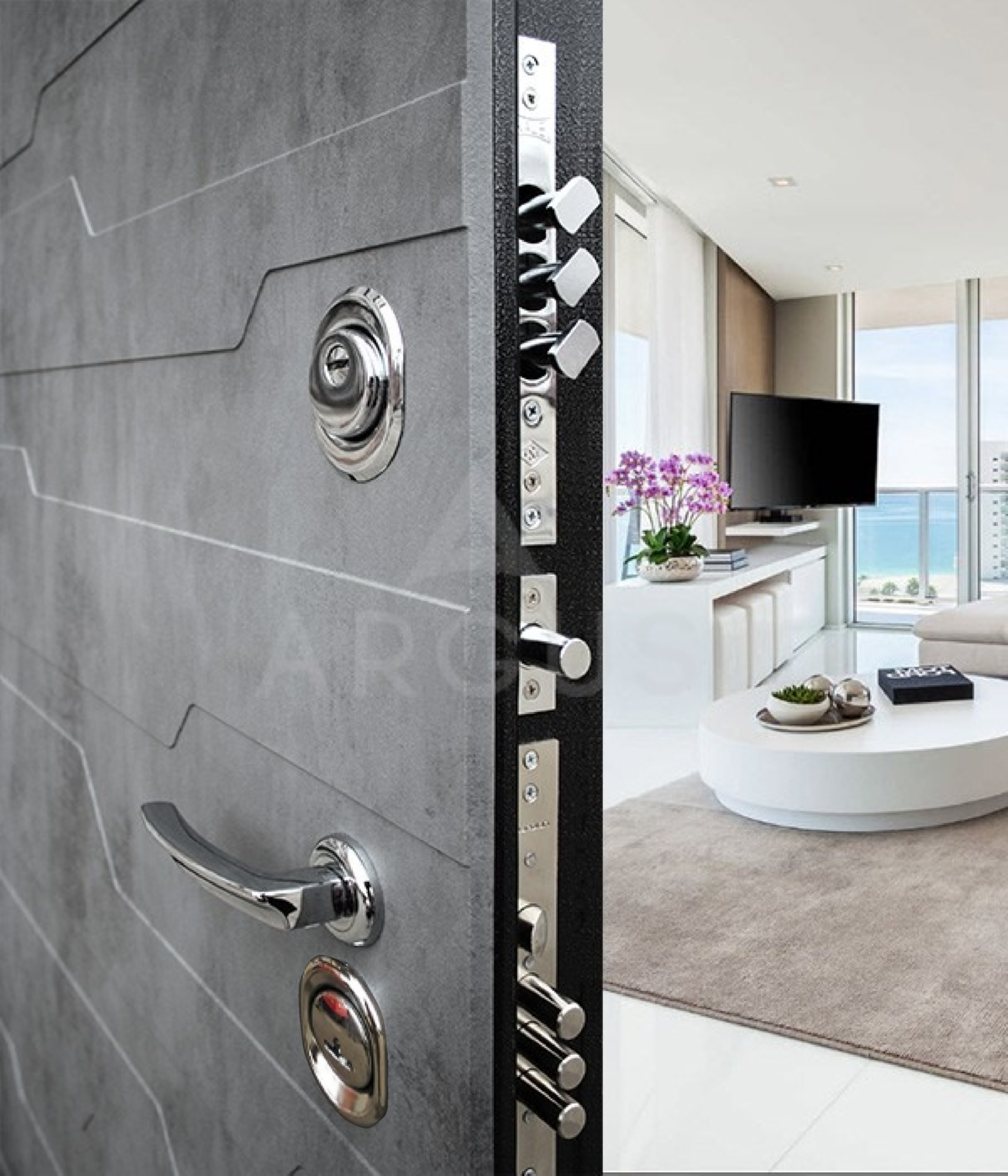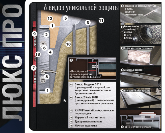 Основной замок-«Гардиан 5011» (Россия) с бронепластиной и защитой от самоимпрессии, сувальдный, IV класс (4 ключа) / «Аргус 512» (Россия) сувальдный, III класс, 7 лет гарантии (4 ключа)